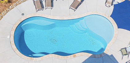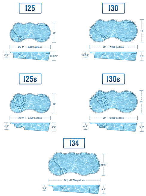 The I Series fiberglass pool offers five size options to choose from, with a stylish, curvy design and a built-in tanning ledge for ultimate relaxation.